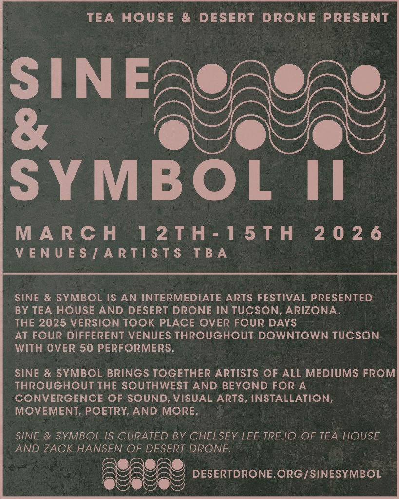 Sine & Symbol brings together artists of all mediums from throughout the Southwest and beyond for a convergence of sound, visual arts, installation, movement, poetry, and more. Sine & Symbol is curated by Chelsey Lee Trejo of Tea House and Zack Hansen of Desert Drone.