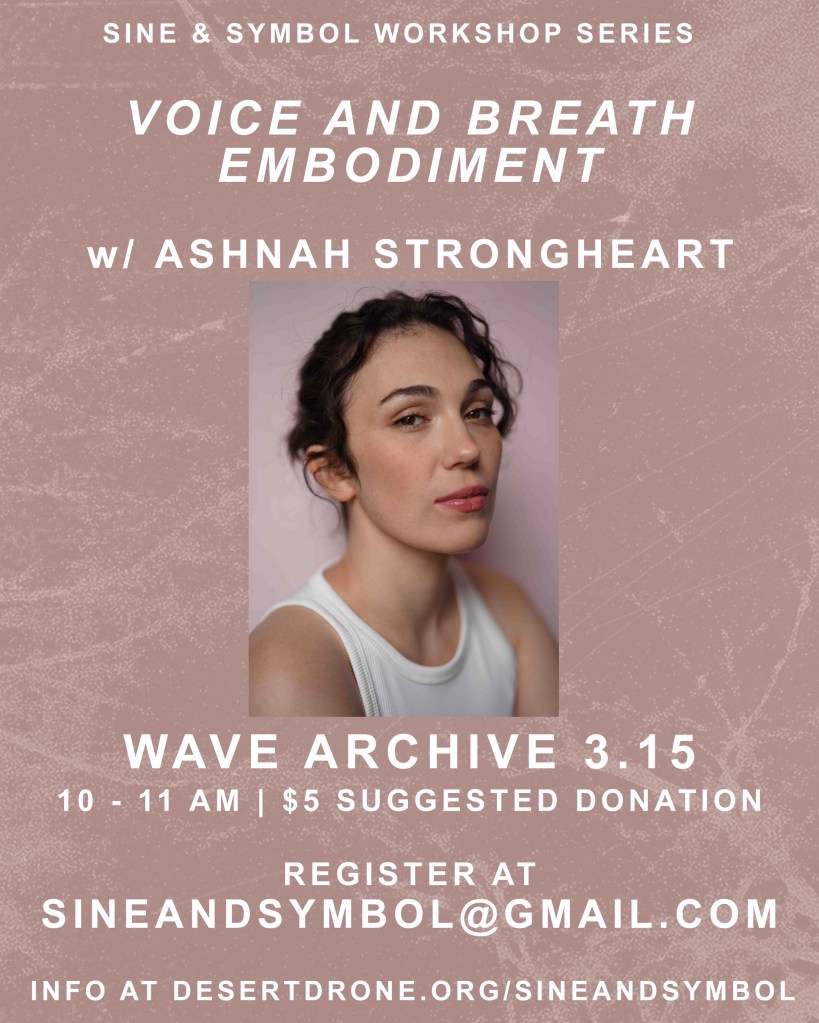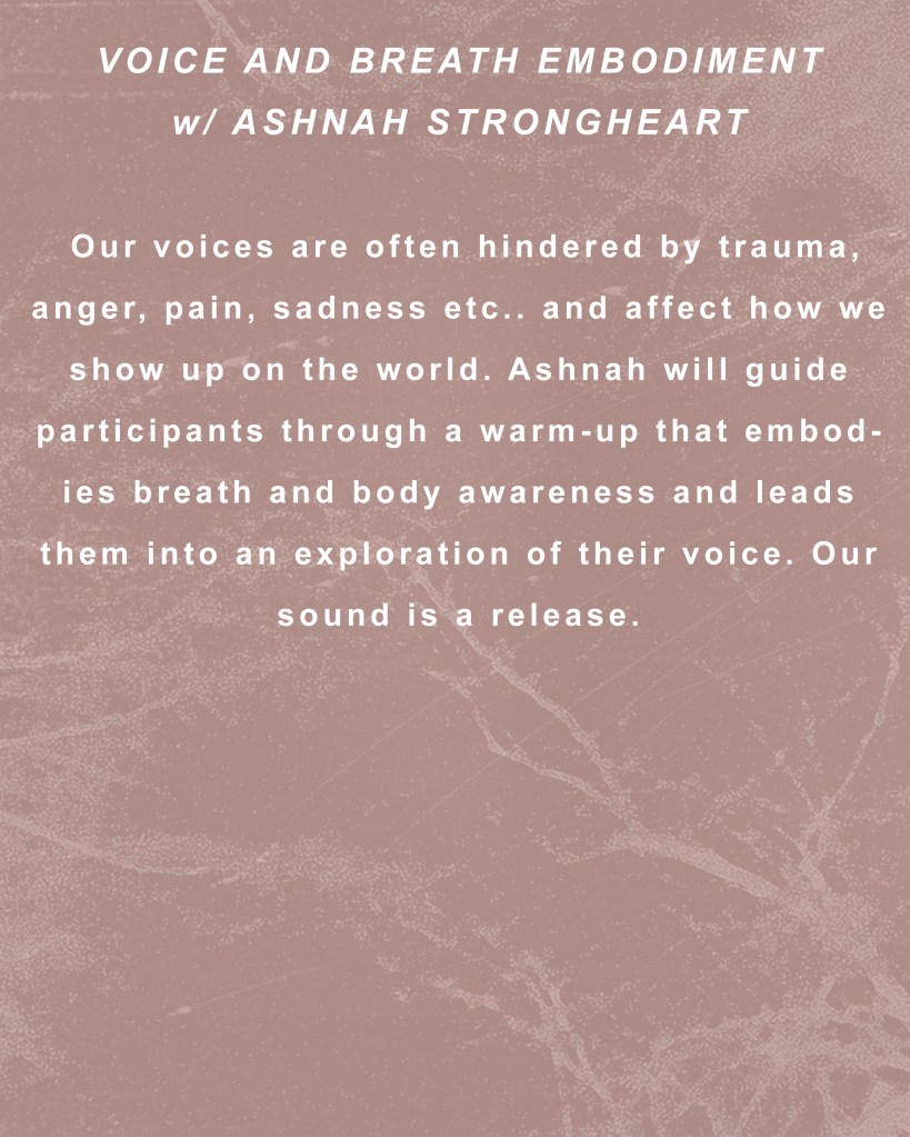 This workshop led by Ashnah Strongheart will go through a full vocal warm-up with the goal of releasing your voice (not for the goal of singing, but for communication). Our voices are often hindered by trauma, anger, pain, sadness etc.. and affect how we show up in the world. Ashnah will guide participants through a warm-up that embodies breath and body awareness and leads them into an exploration of their voice. Our sound is a release.