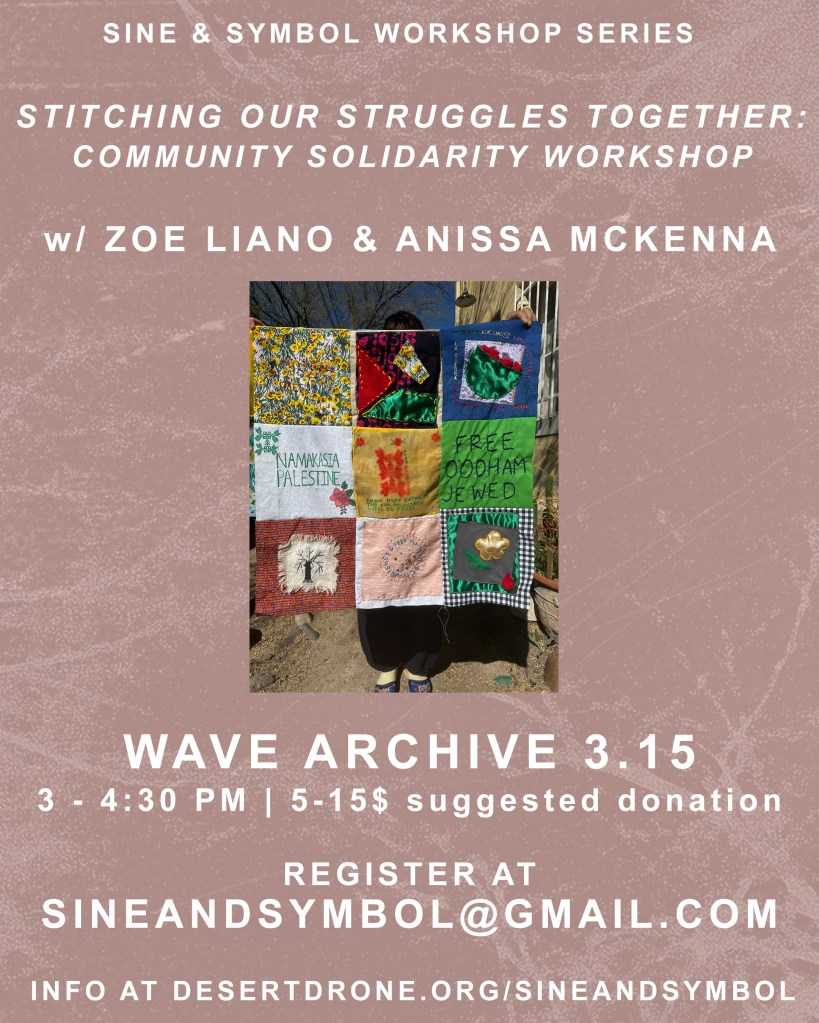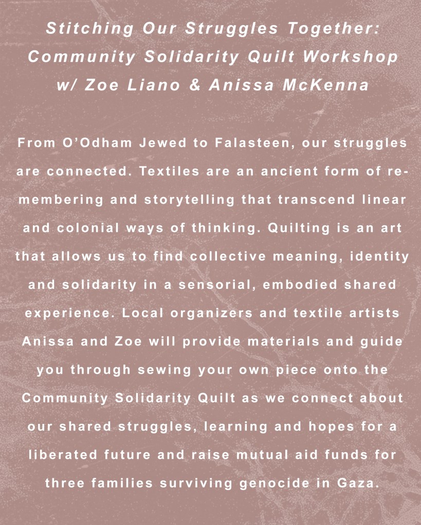 From O’Odham Jewed to Falasteen, our struggles are connected. Textiles are an ancient form of remembering and storytelling that transcend linear and colonial ways of thinking. Quilting is an art that allows us to find collective meaning, identity and solidarity in a sensorial, embodied shared experience. Local organizers and textile artists Anissa and Zoe will provide materials and guide you through sewing your own piece onto the Community Solidarity Quilt as we connect about our shared struggles, learning and hopes for a liberated future and raise mutual aid funds for three families surviving genocide in Gaza.